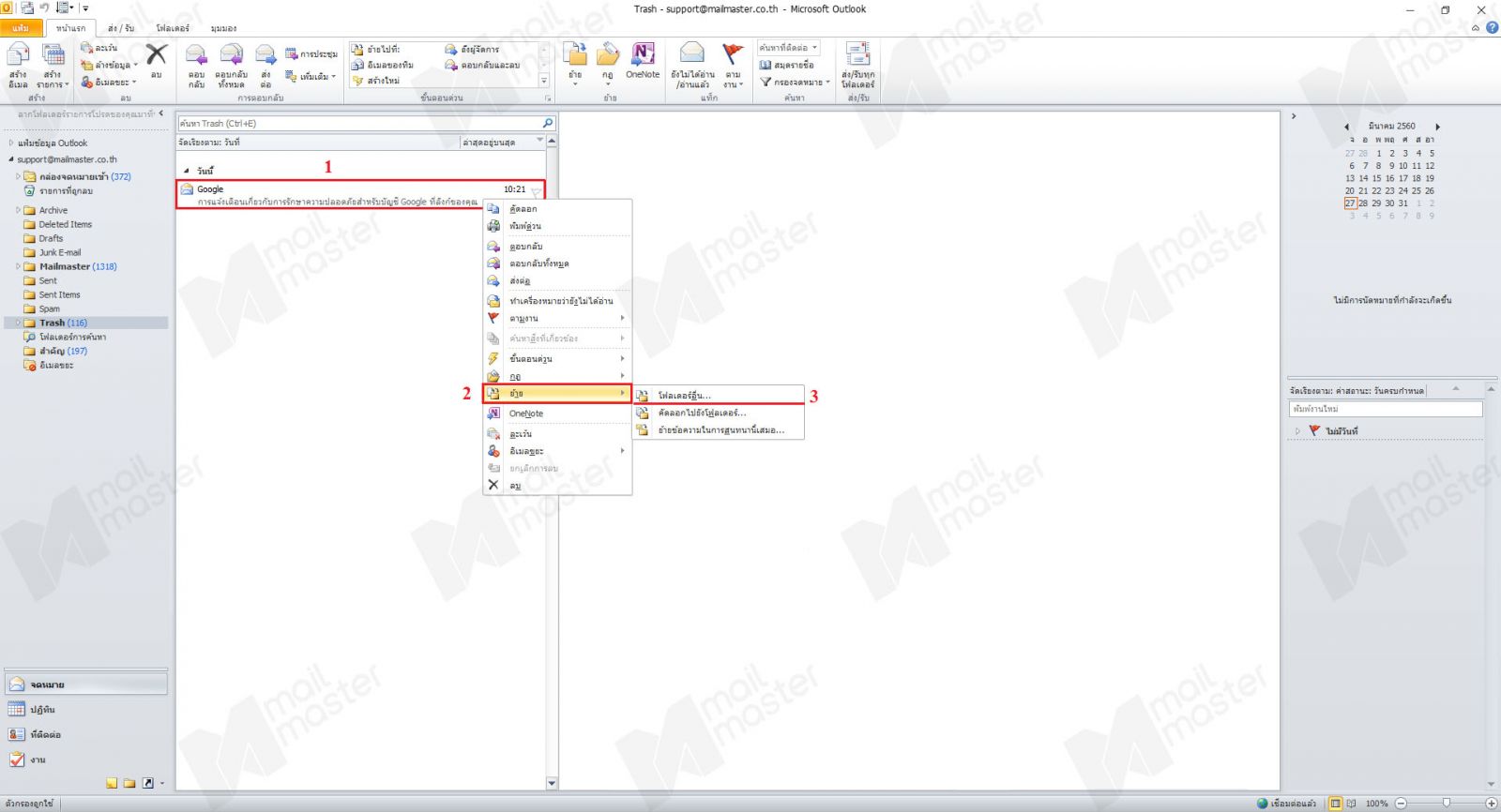เข้าไปที่ Trash กดเลือกอีเมลที่ต้องการกู้คืน จากนั้นคลิกขวาแล้วจะปรากฏเมนูตามรูปตัวอย่าง กดที่ “ย้าย” และจะมีเมนูย่อยให้เลือก ซึ่งสามารถเลือกได้ว่าจะย้ายอีเมลจาก Trash(ถังขยะ)ไปไว้ที่ใด