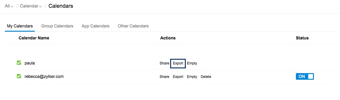 3. คลิกที่ตัวเลือก " ส่งออก " ถัดจากปฏิทินที่คุณต้องการดาวน์โหลด