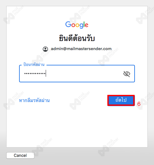 6. เมื่อปรากฏหน้าจอดังรูปภาพให้กรอกรหัสผ่านลงไป เสร็จแล้วคลิกที่คำว่า “ถัดไป”