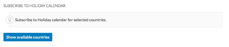 ปฏิทินวันหยุดโดยค่าเริ่มต้นใน Zoho Calendar คุณสามารถเลือกปฏิทินวันหยุดและสมัครสมาชิกได้ ปฏิทินจะถูกเพิ่มในปฏิทินโซโหของคุณและคุณสามารถติดตามวันหยุดได้ในภูมิภาคของคุณ