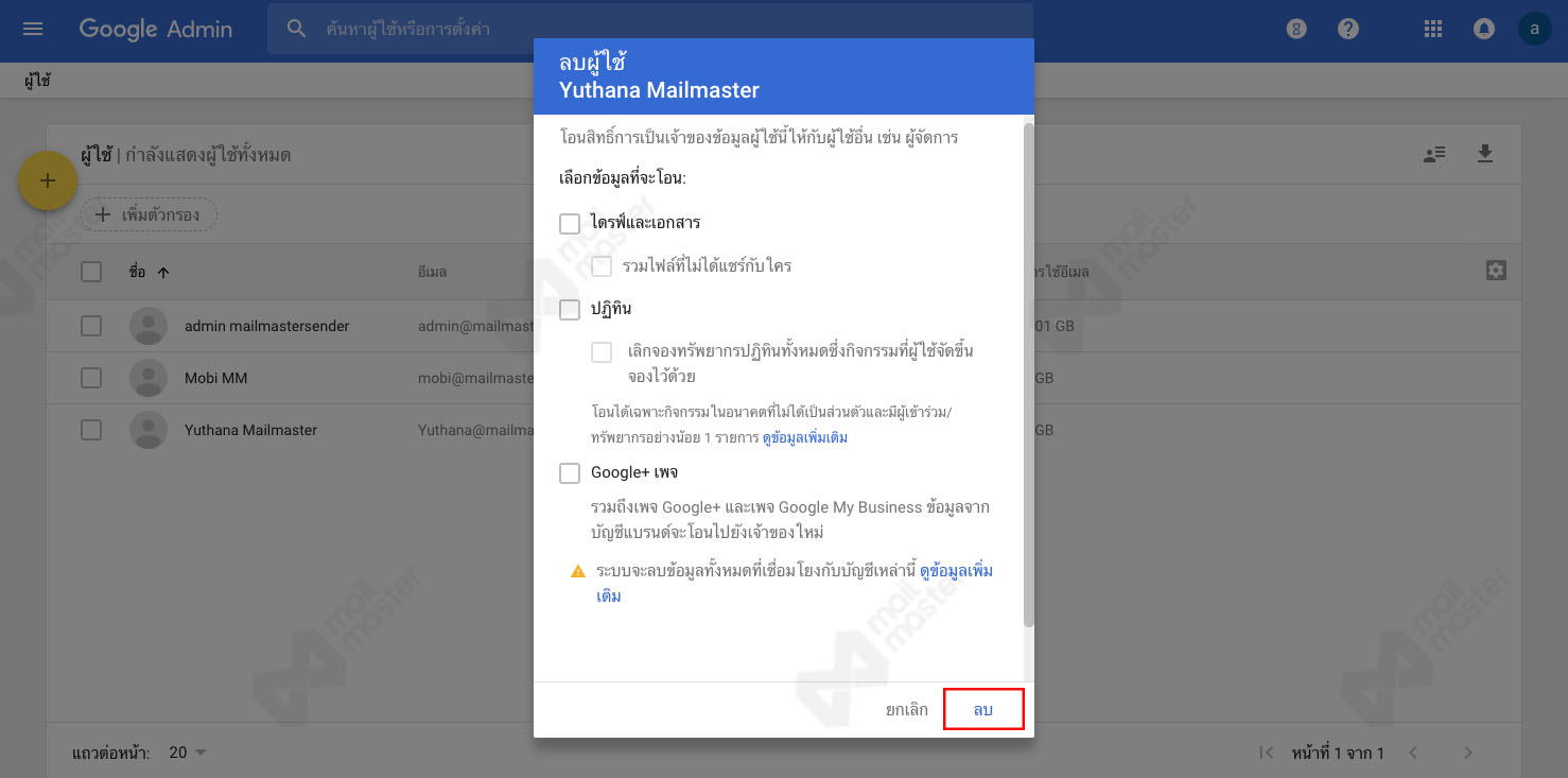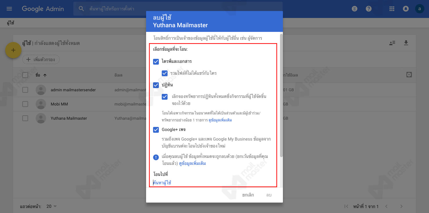 - แบบที่ 1 สามารถเลือกโอนข้อมูลของผู้ใช้ที่จะลบไปยังอีเมลอื่นได้