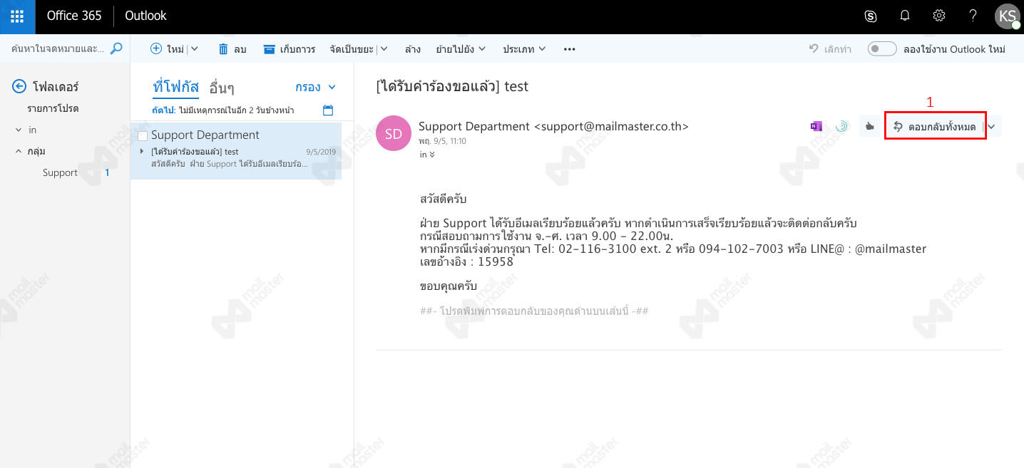 1. เลือกอีเมลที่ต้องการตอบกลับ >> คลิกที่ปุ่ม "ตอบกลับทั้งหมด"
