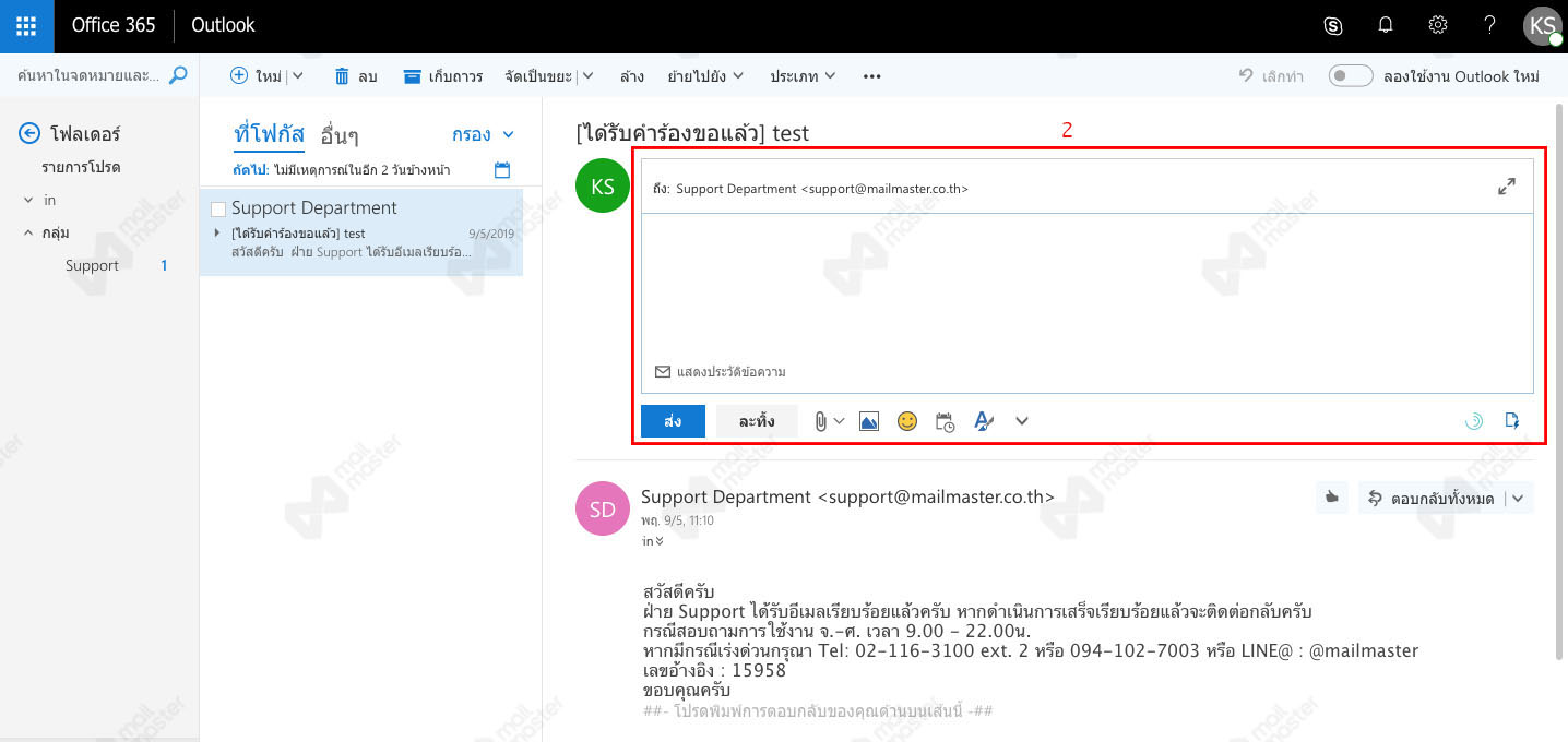 1. เลือกอีเมลที่ต้องการตอบกลับ จากนั้น คลิกที่ปุ่ม " v " 2. จะเห็นตัวเลือก "ตอบกลับ" 3. เขียนข้อความตอบกลับที่ช่องเขียนข้อความได้เลย (ตามรูป)