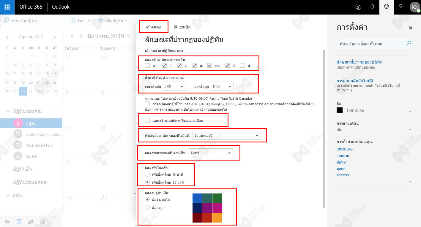 - แสดงปฏิทินเป็น : กำหนดลักษณะของสีที่ต้องการให้แสดงบนปฏิทิน