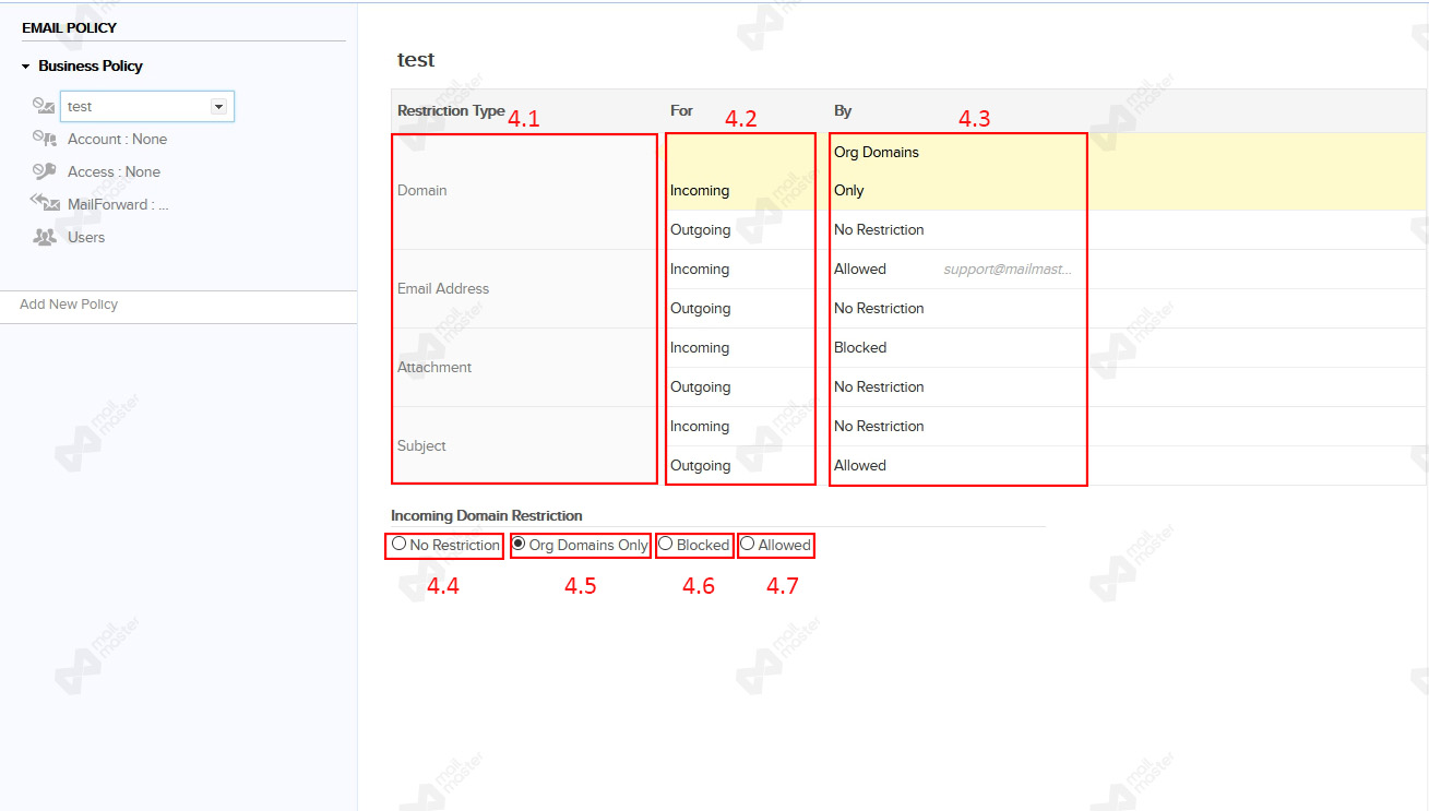 ในส่วนนี้ คุณสามารถกำหนดโดเมน ที่อยู่อีเมล ชนิดของไฟล์แนบ และข้อความหัวเรื่องที่ได้รับอนุญาตหรือถูกบล็อคสำหรับอีเมลขาเข้าและขาออกได้