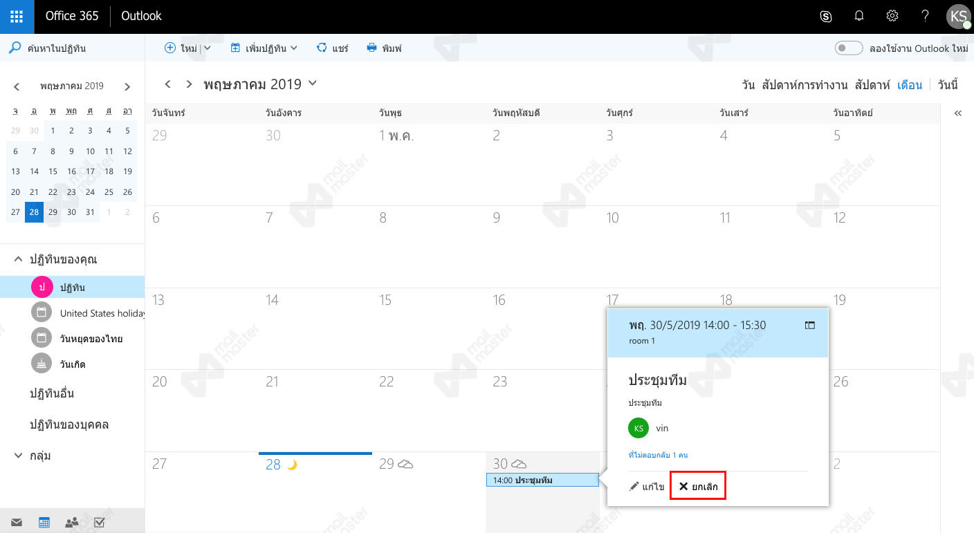 ระบบจะส่งอีเมลแจ้งเตือนให้ผู้เข้าร่วมการนัดหมายทราบ ว่าได้ยกเลิกการนัดหมาย ในครั้งนี้แล้ว