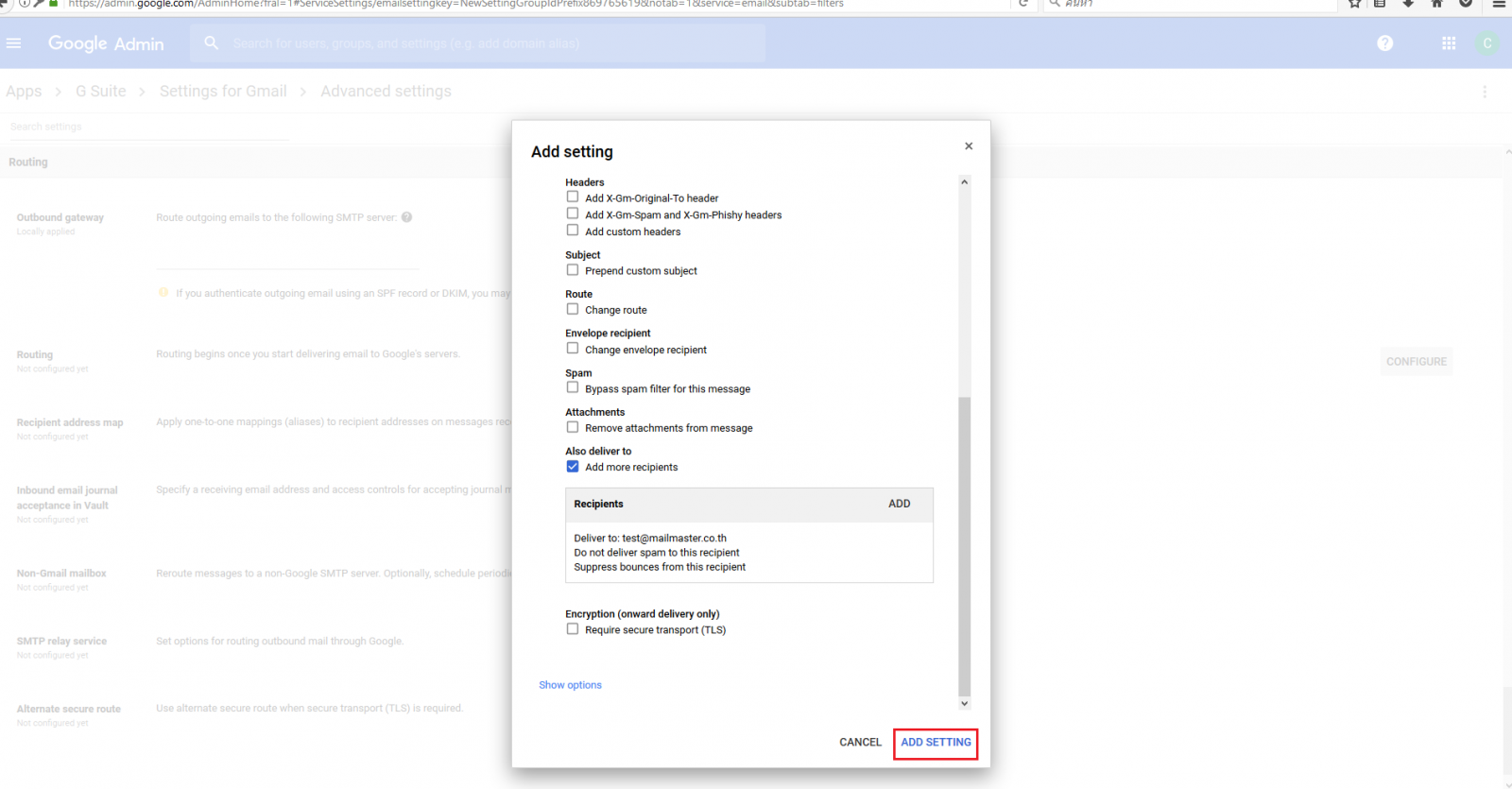 7. จากนั้นเลื่อนลงมาที่หัวข้อ Also Deliver to แล้วเลือก Add more recipients และ ADD ชื่ออีเมลที่ต้องการให้อีเมลทุกฉบับเข้าไป แล้วกด Add Settings