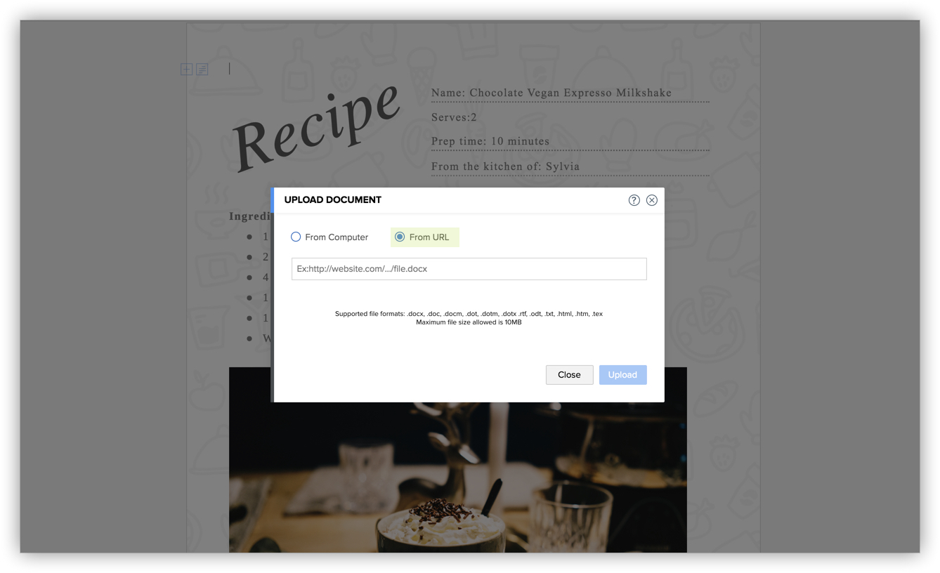 คุณสามารถนำเข้าเอกสารเว็บไปที่ Writer โดยใช้ URL ของเอกสารเว็บ อย่างไรก็ตามคุณสมบัตินี้รองรับเฉพาะรูปแบบเอกสารเว็บ ( .docx, .doc, .docm, .dotx, .dotm, .odt, .txt, .txt, .htm, .tex )
