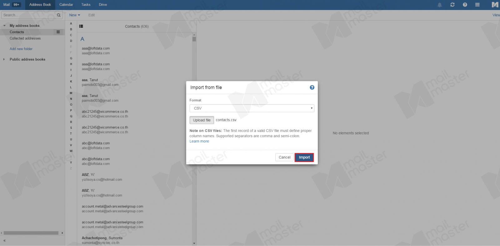 13 คลิกที่ Import (รายชื่อผู้ติดต่อจะอยู่ใน Folder ที่เลือกไว้ข้างต้น)