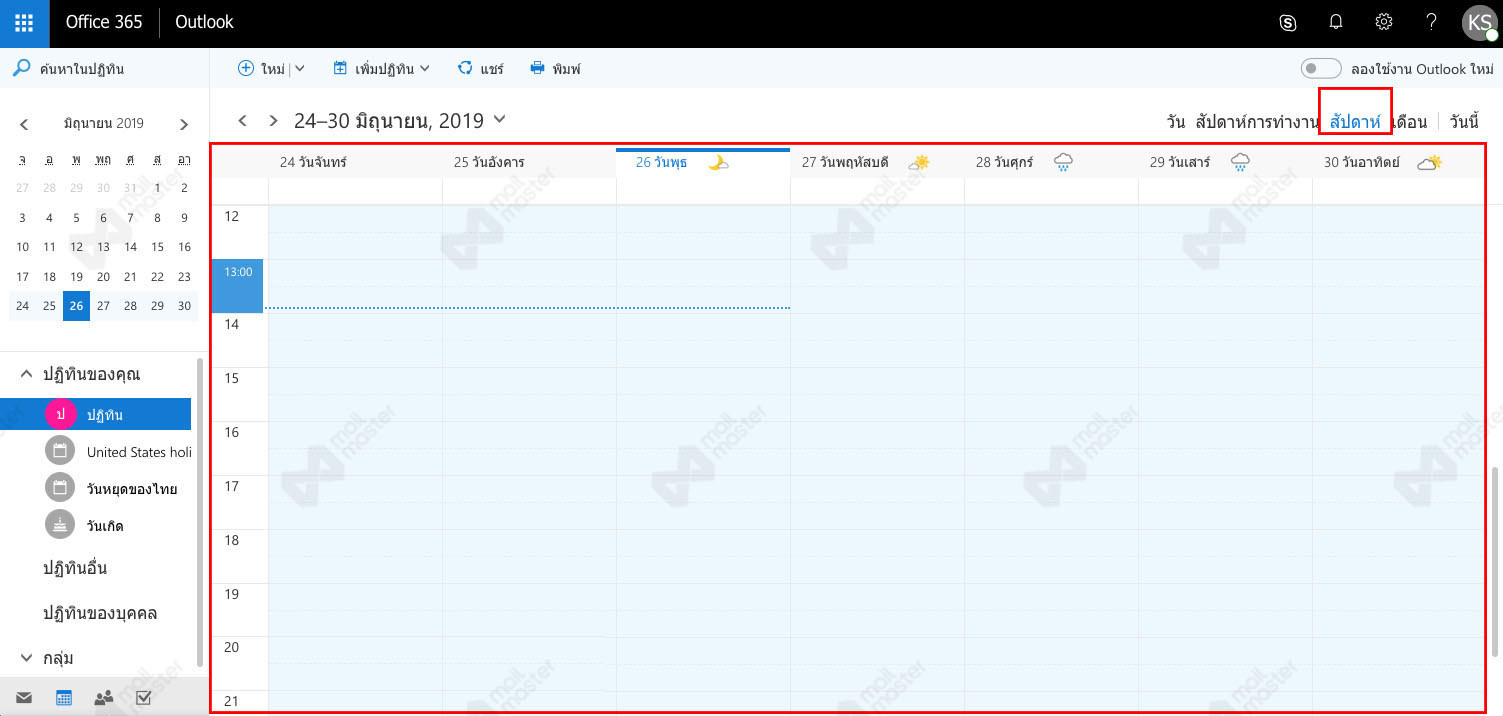 ในตัวอย่าง เลือกมุมมองแบบ "สัปดาห์"