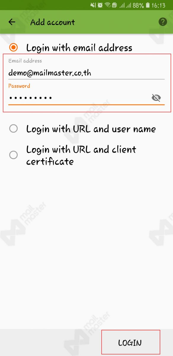 1. ใส่ email password แล้วกด Next 2. เลือก IMAP 3. ใส่ IMAP server เป็น imap.mailmaster.co.th Security เป็น SSL/TLS Port เป็น 993 ใส่ Username password กด Next 4. ใส่ SMTP server เป็น smtp.mailmaster.co.th ...