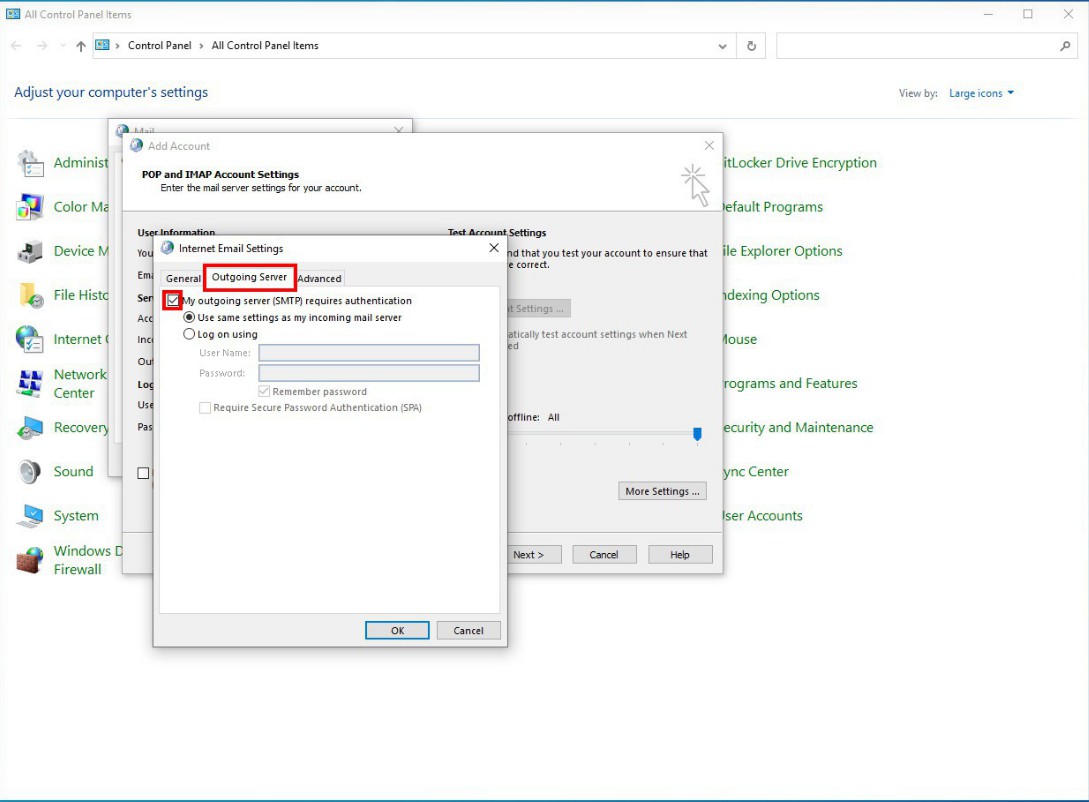 - The Internet Email Setting window will appear, choose “Outgoing server” then click on “My Outgoing server” (as shown in the picture) then choose “Advanced”