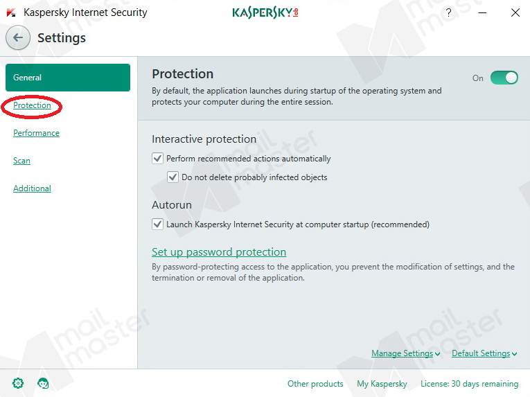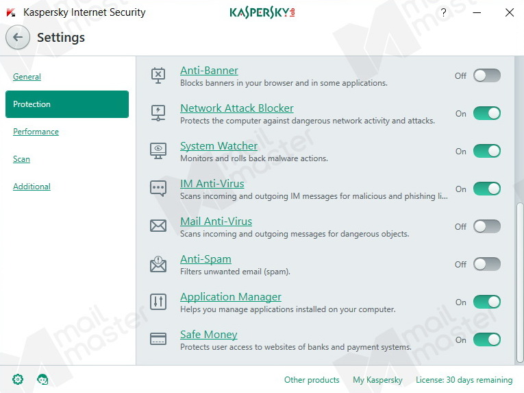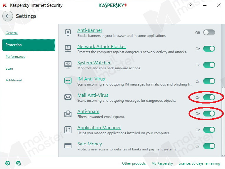 05.เข้าหน้าเมนู Protection แล้ว ให้คลิก ปุ่มเขียว ในหัวข้อ Mail Anti-Virus และ AntiSpam เพื่อปิด