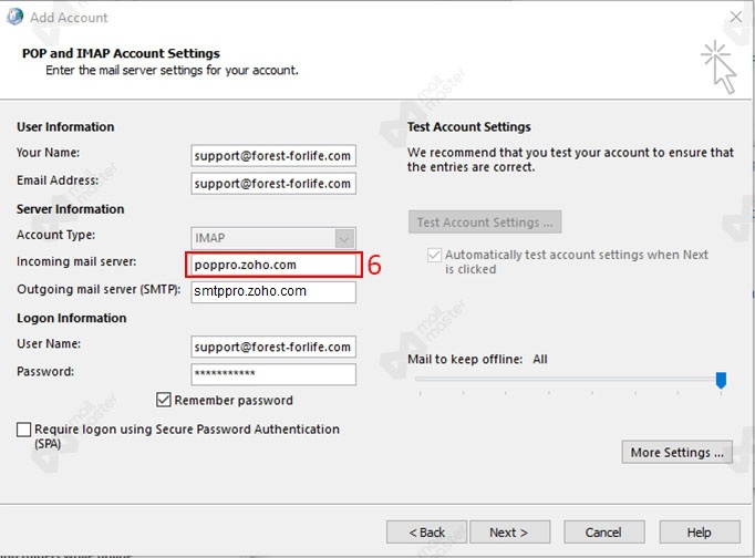 6. จะปรากฏหน้าต่าง POP and IMAP Account Settings ให้ " กรอกข้อมูลที่ช่องว่างทุกช่อง "