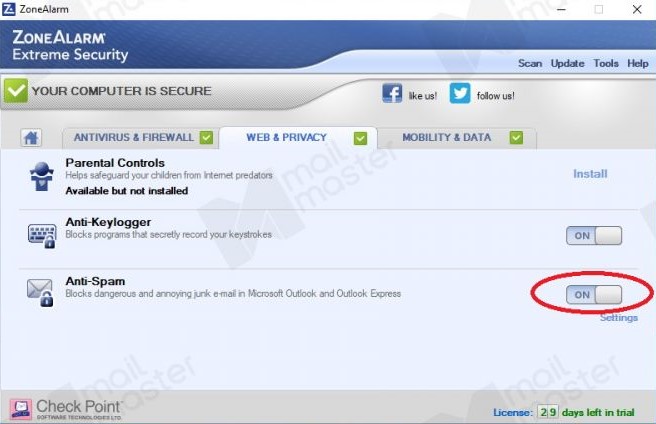 04.หลังจากนั้นจะมีหน้าเมนูของ WEB & PRIVACY ให้ดูหัวข้อ Anti-spam ให้คลิกที่ปุ่ม ON